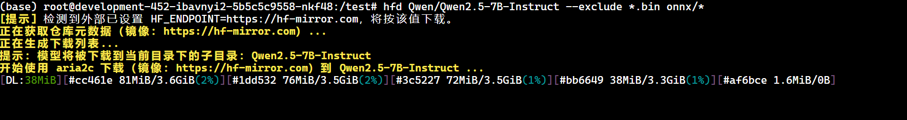 Section titled “排除不需要的文件”hfd Qwen/Qwen2.5-7B-Instruct --exclude *.bin onnx/*