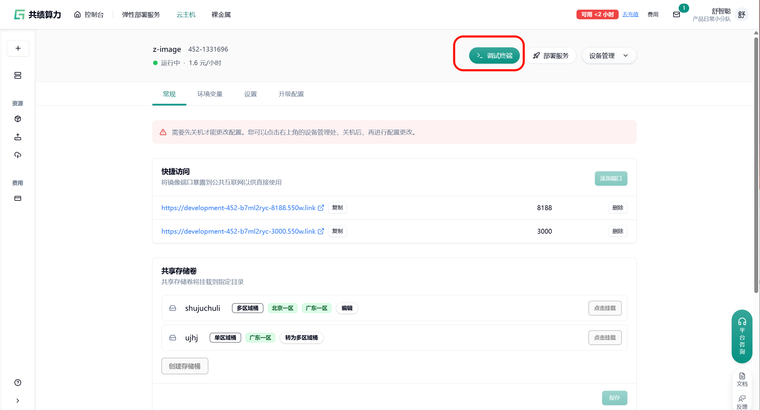 Section titled “云主机方式(推荐)”- 启动云主机实例,并通过浏览器或 SSH 进入调试终端(Console)