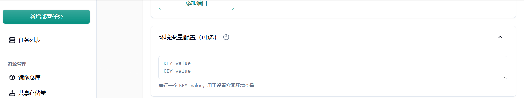 Section titled “4.3 环境变量转换”Docker 中的 -e KEY=VALUE 在 Kubernetes 中通过环境变量配置,在平台配置界面中设置环境变量即可。