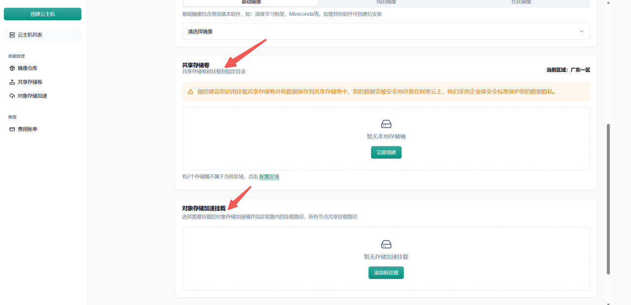 Section titled “4.2 存储卷挂载转换”Docker 中的 -v data:data 在平台对应的是设置对象存储加速或者共享存储卷。在平台配置界面中设置存储卷挂载即可。