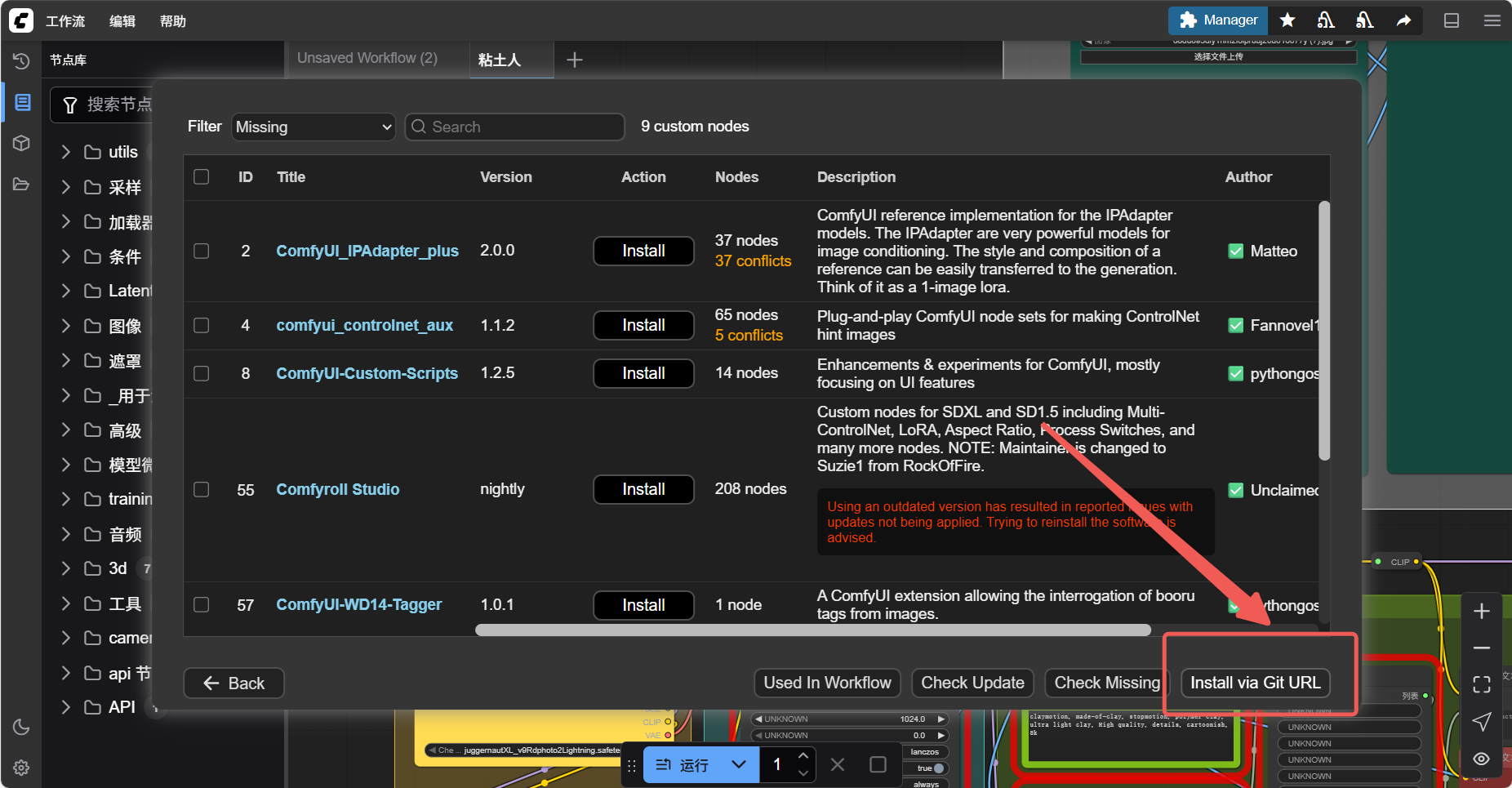 此时我们可以通过 Install via Git URL 来从 github 仓库上直接拉取对应节点的内容