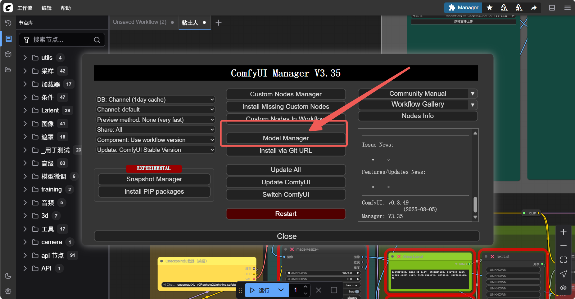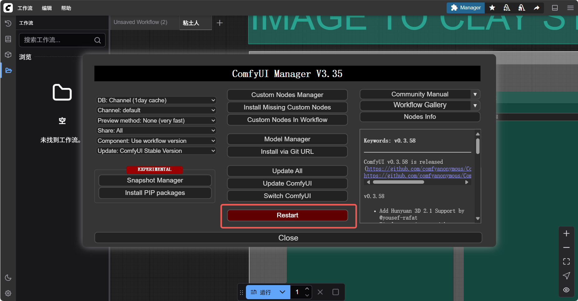 节点安装完成后按照提示重新启动 comfyUI 刷新浏览器