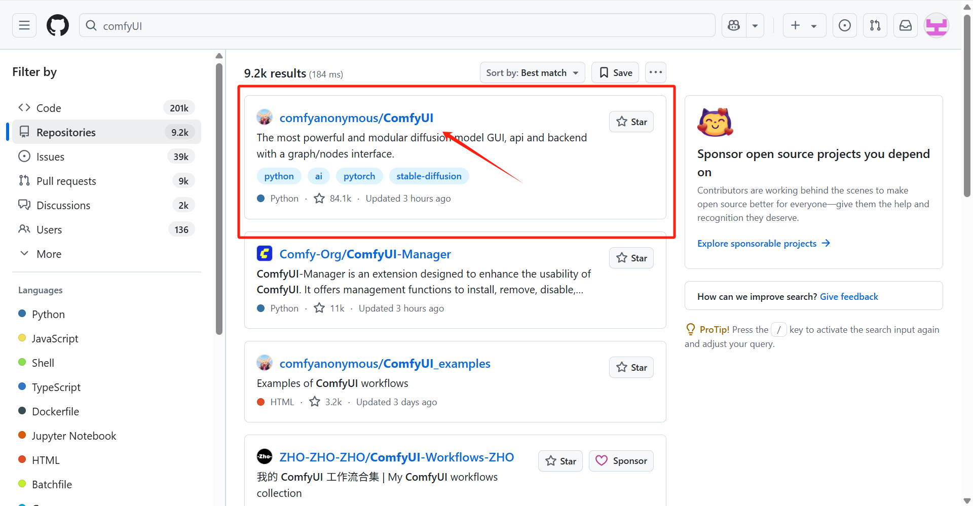 Section titled “4.直接下载模型文件”- 打开 github 官网 https://github.com/(需要登录),搜索`comfyUI`,点击