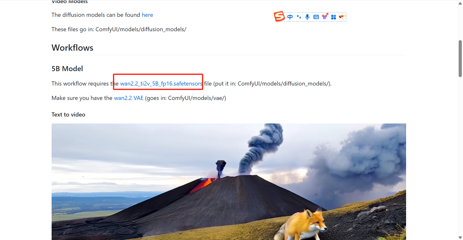 - 之后页面下翻,找到“wan2.2_ti2v_5B_fp16.safetensors”,点击进入并点击 Download 下载