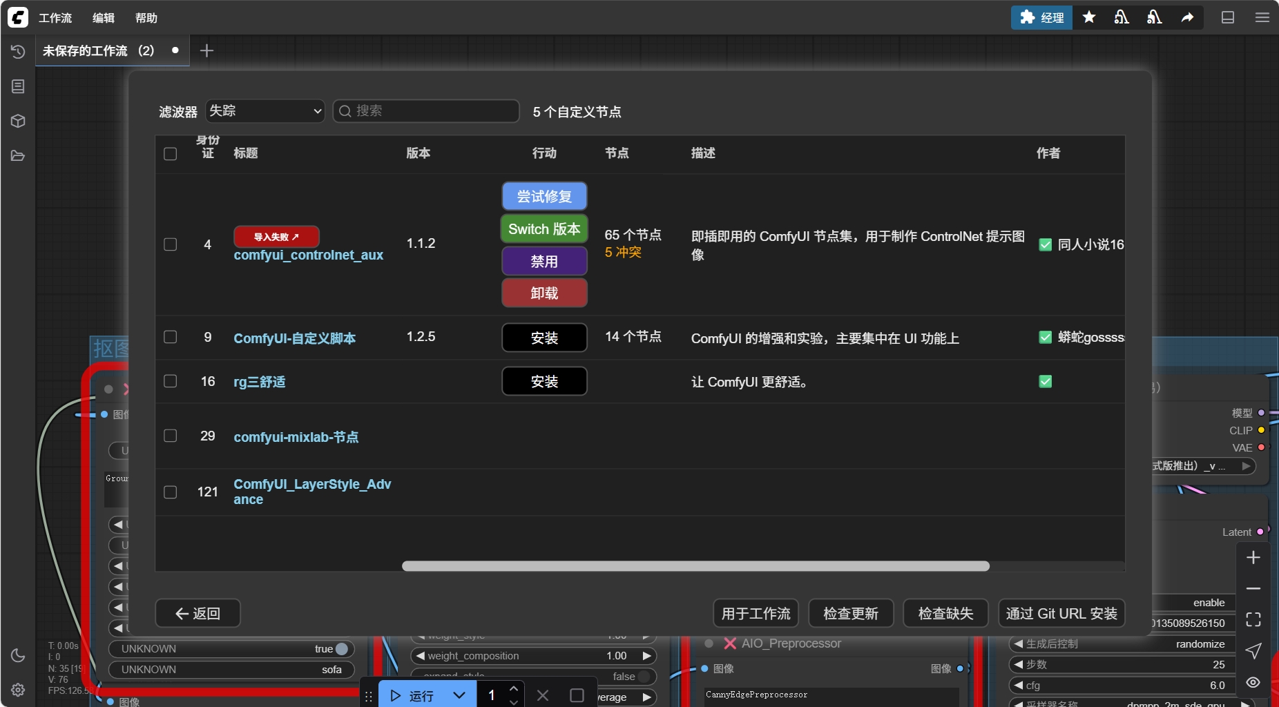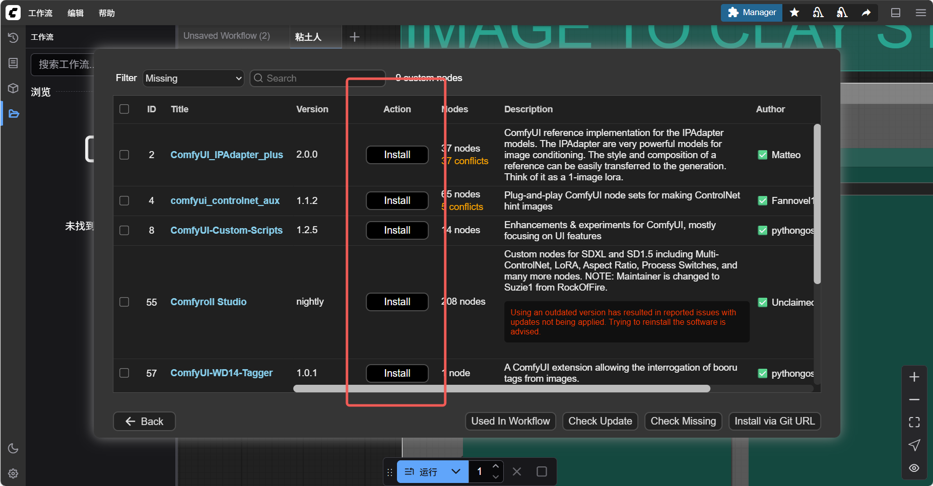 在 WebUI 中点击 Manager → Install Missing Custom Nodes,工具会自行搜索缺失节点(如 ControlNet