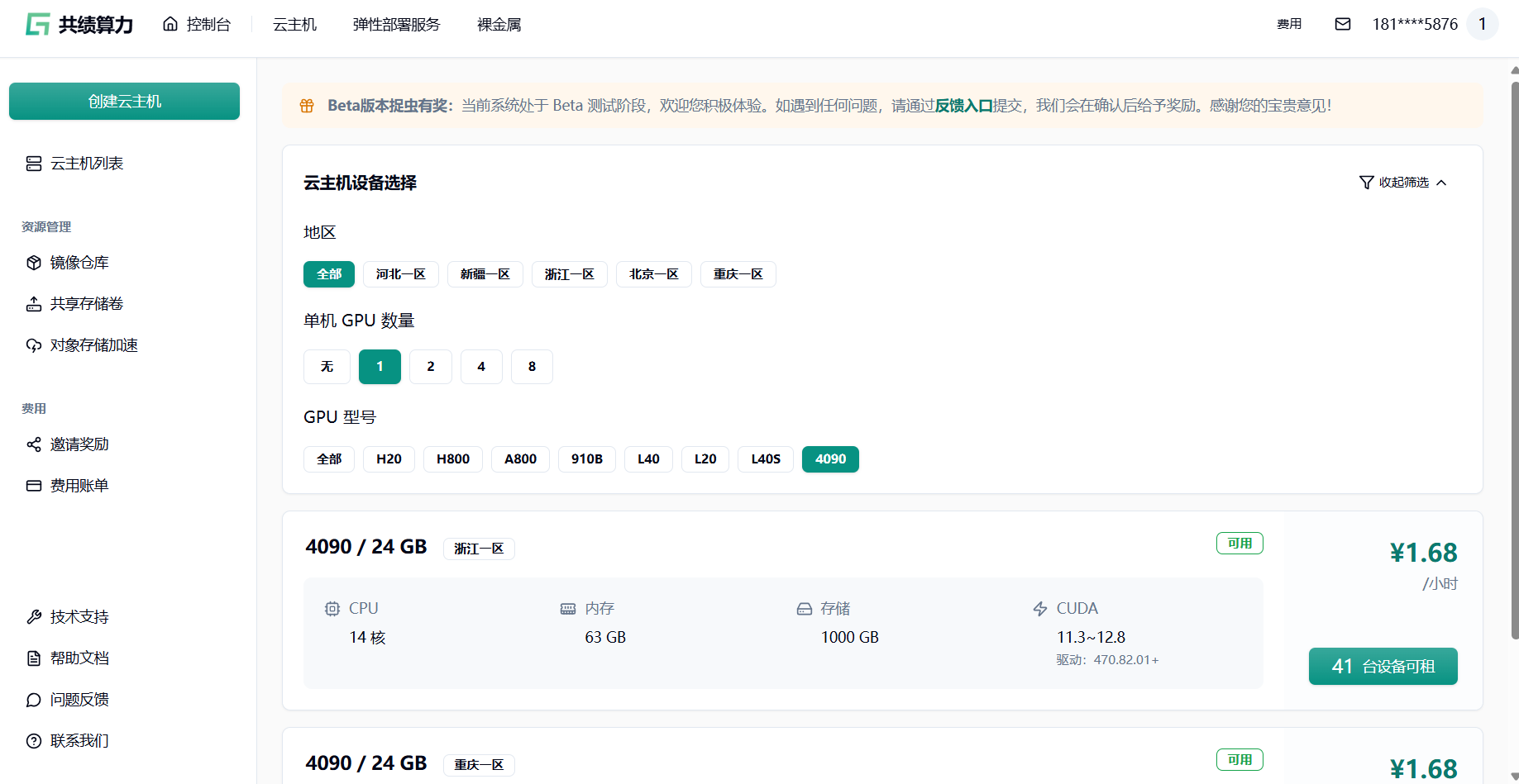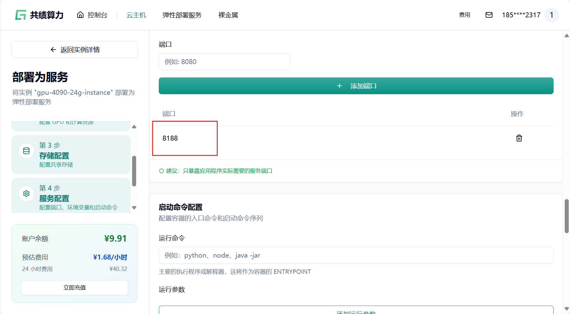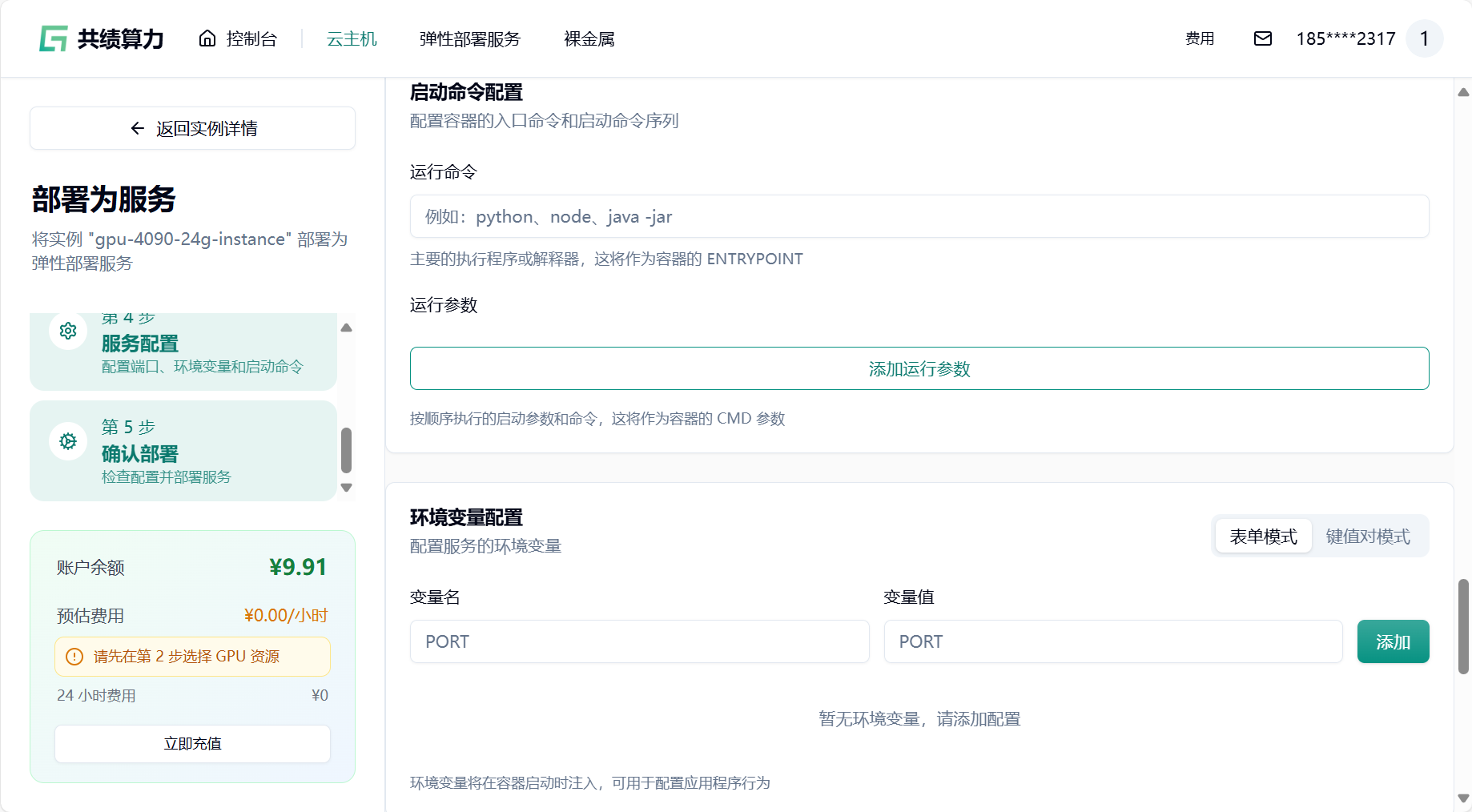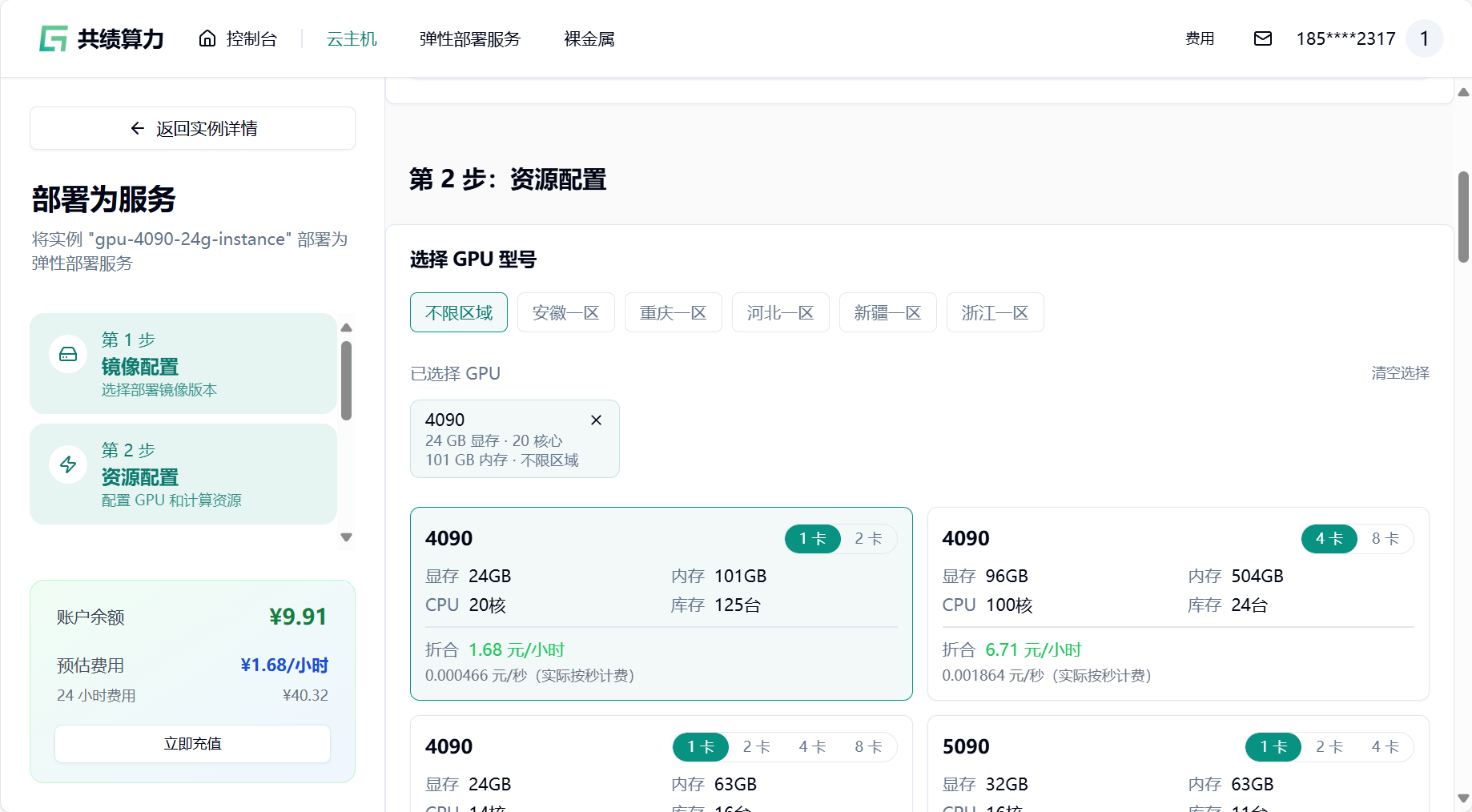 - 选择 GPU 配置(如 4090),节点默认选择 1 个