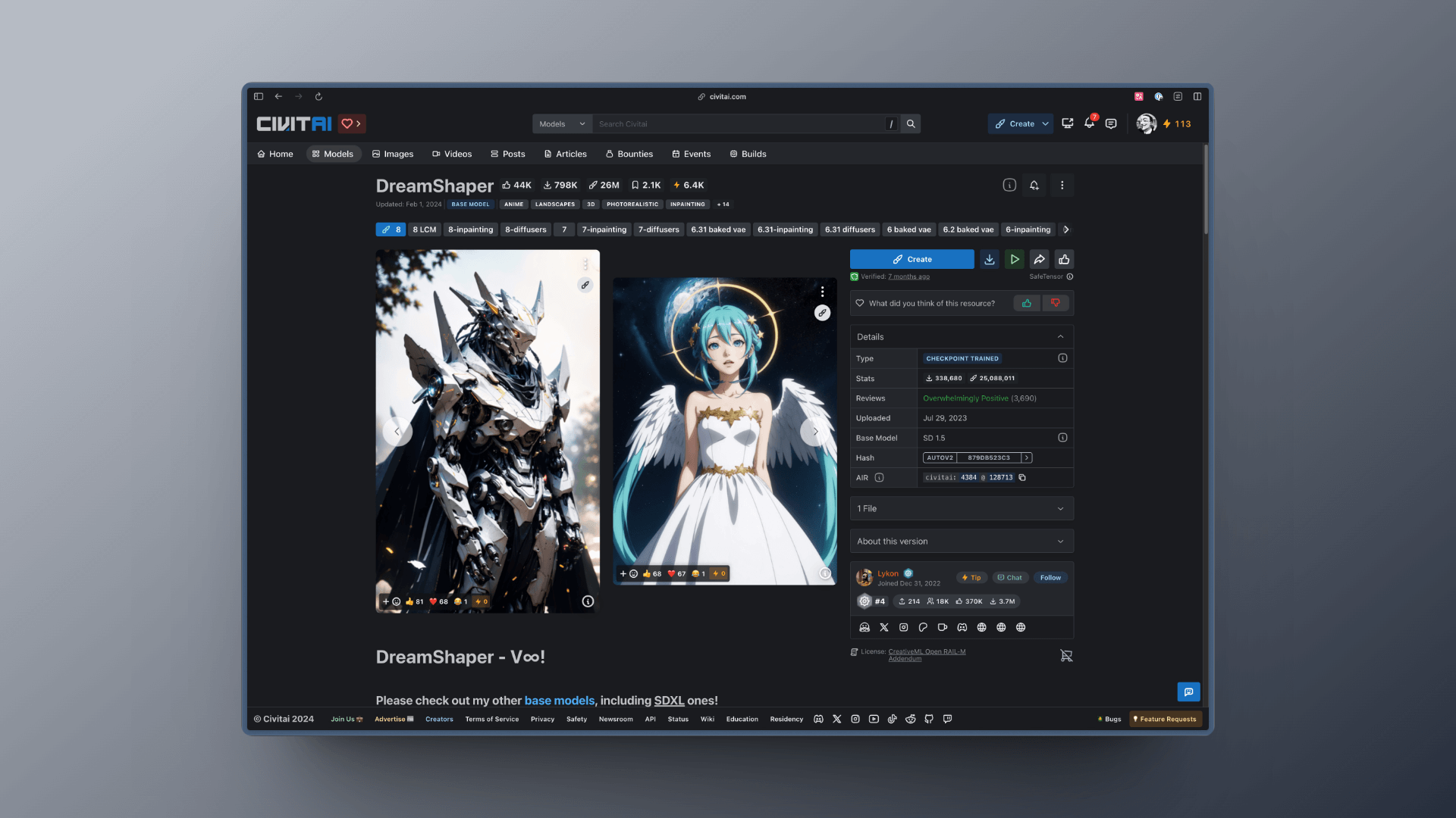 同样的,你也可以通过 CivitAI 的搜索功能来搜索你想要的模型,并下载该模型,以 DreamShaper 为例,你只要点击下载按钮即可下载模型: