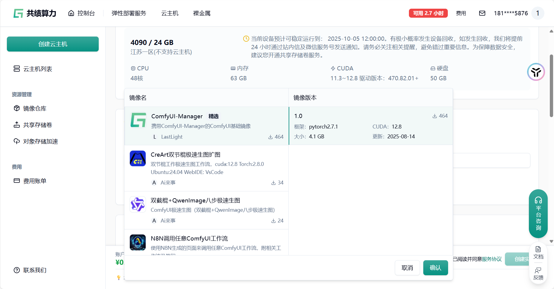 登录共绩算力云主机控制台,在社区镜像中选择我们自带 ComfyUI Manger 的基础镜像