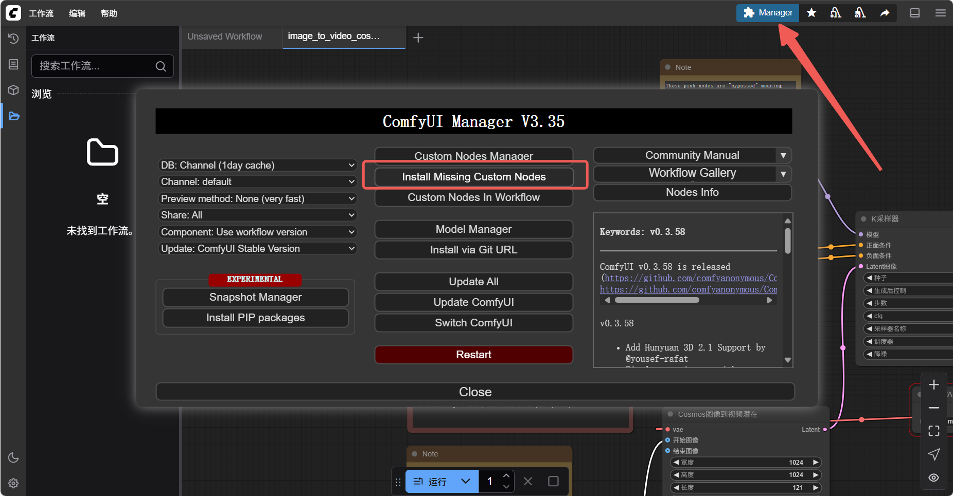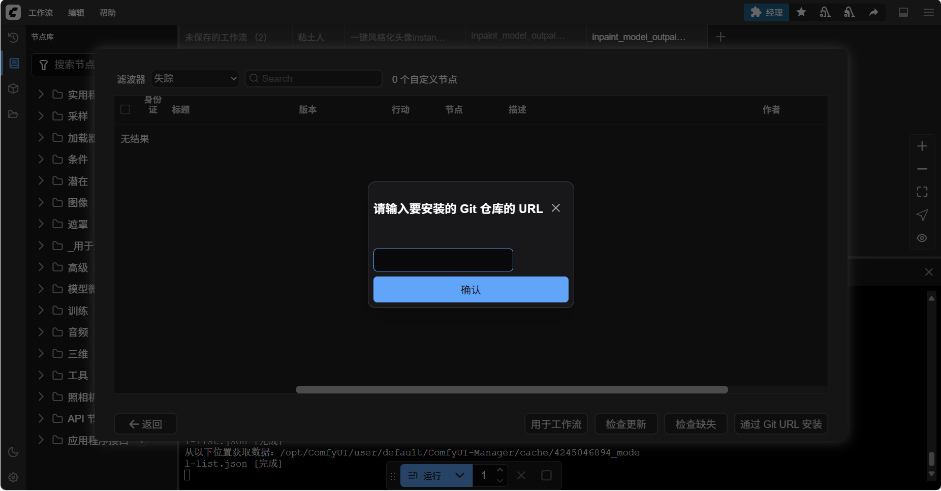 Section titled “2. 下载缺失节点”- 方法一:通过 ComfyUI Manager 自动安装