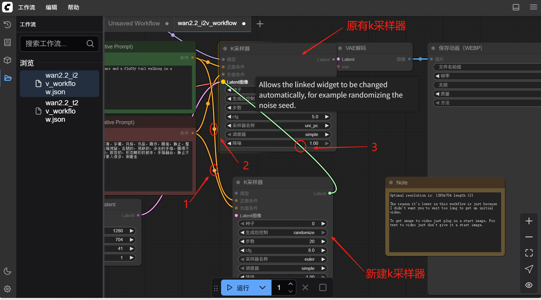 Section titled “2 对 WAN2.2 新增节点”通过对 wan2.2 工作流的调整,可提高成果质量,根据个人需求新增节点即可,以下展示一种简单的去噪方法作为示范:
