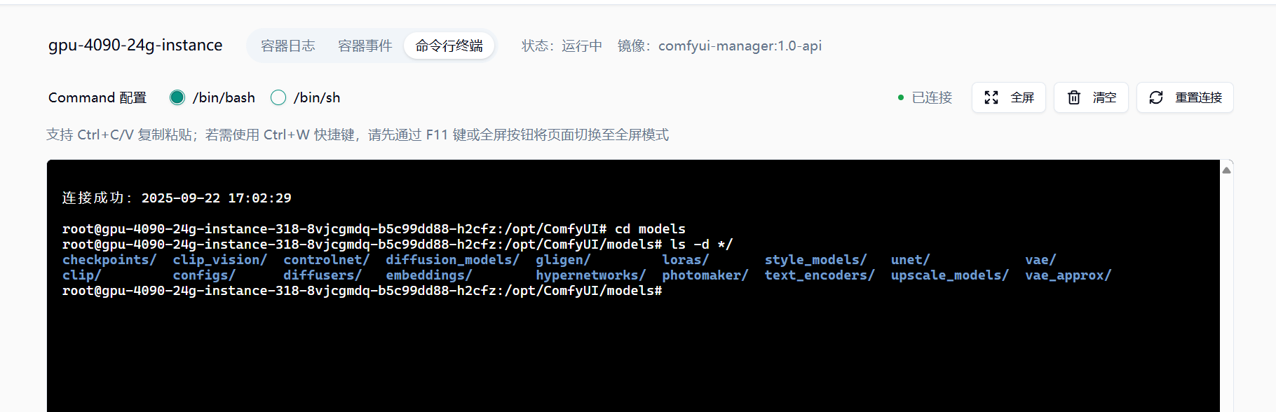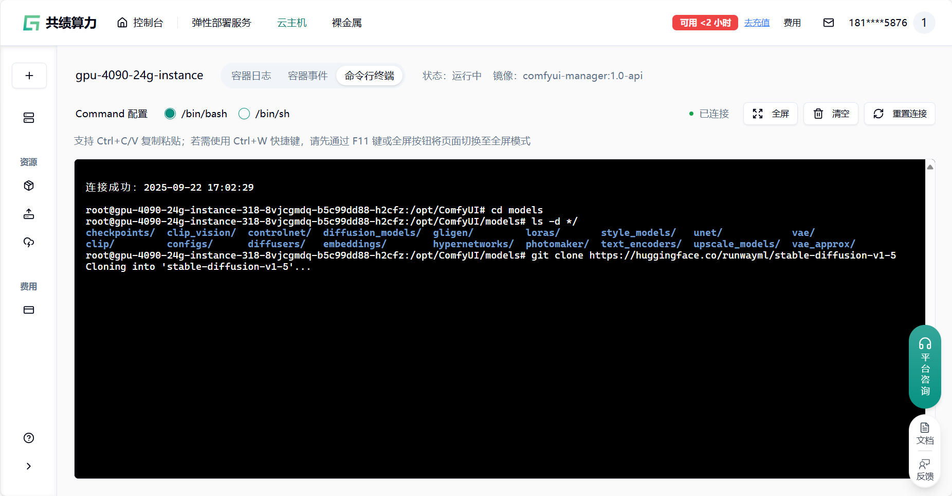 Section titled “3.2.4 模型下载导入镜像”在获取到模型下载地址后,我们需要将模型通过指令下载到 ComfyUI 的 models 目录下,这样 ComfyUI 才能够加载到对应的模型。
