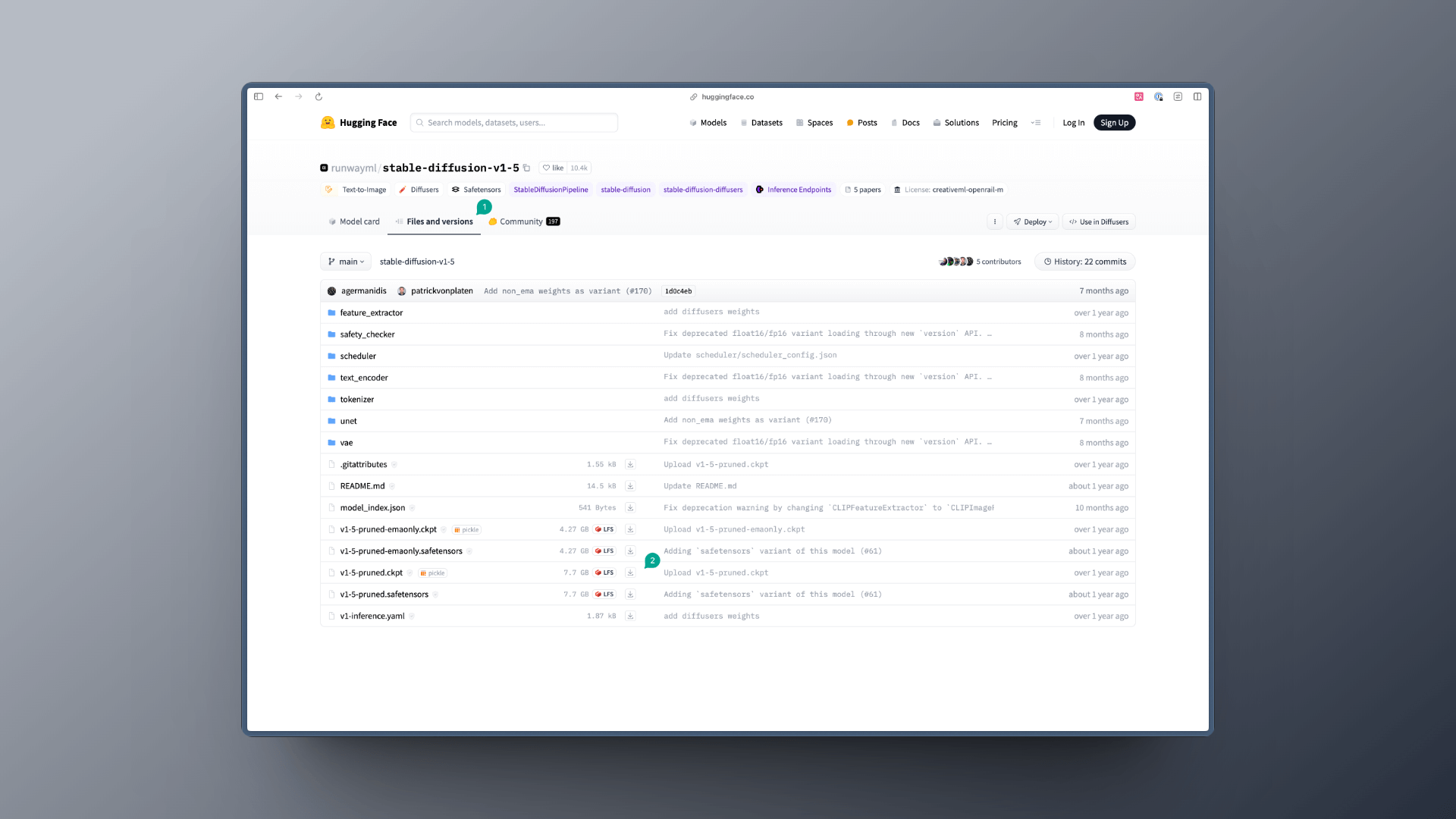 比如我们搜索 Stable Diffusion v1.5,你会看到这样的页面,然后我们点击页面里的 Files and versions 按钮(图中 1),接着你会看到很多文件,此时你需要选择你需要下载的模型文件,然后点击下载按钮或者获取到下载的链接后续在节点中进行终端下载操作: git clone https://huggingface.co/runwayml/stable-diffusion-v1-5
