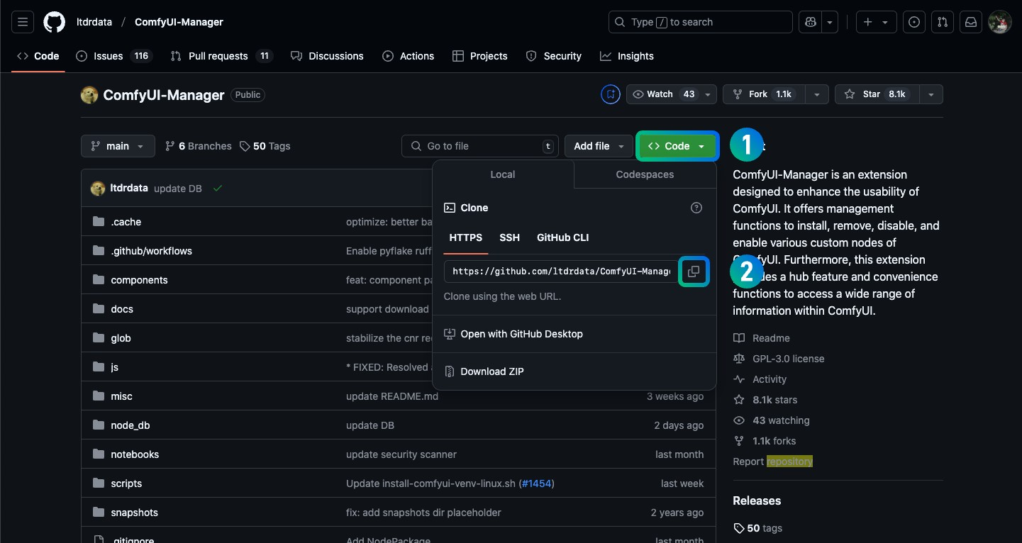 - 你将复制得到 https://github.com/ltdrdata/ComfyUI-Manager.git 的链接
