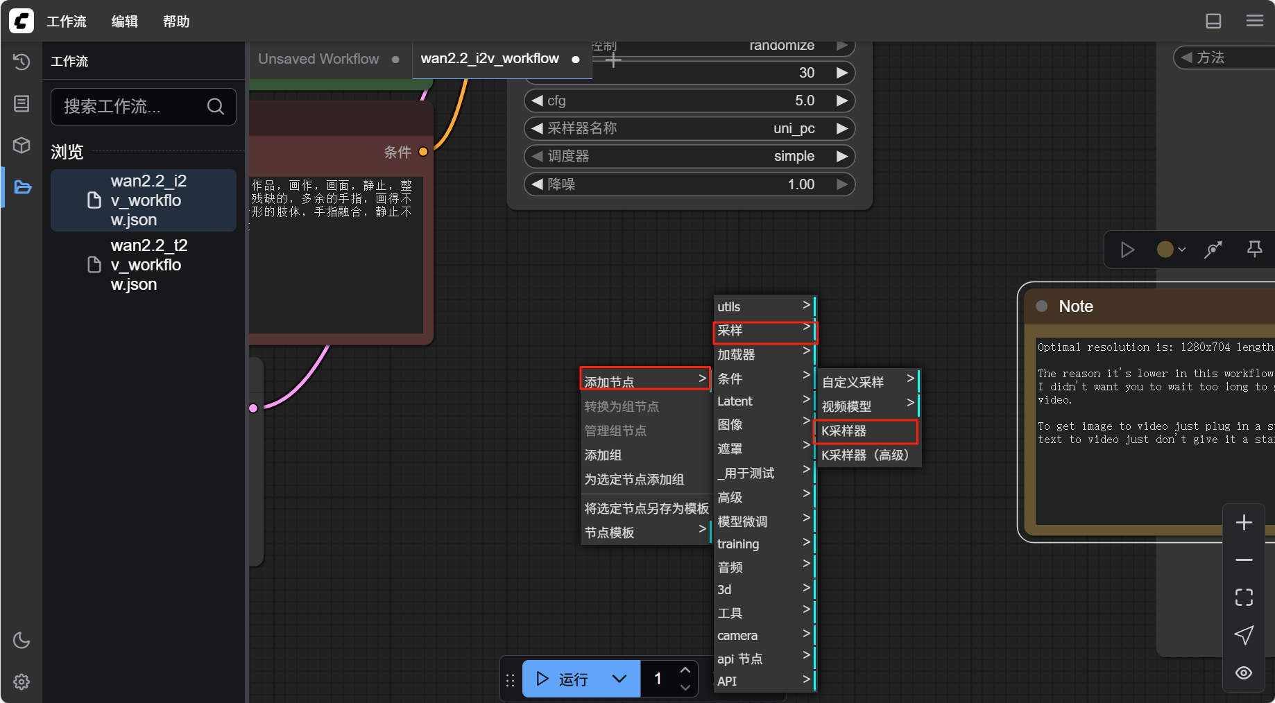 - 在空白处右键,找到“添加节点”中的“采样”,选择“k 采样器”
