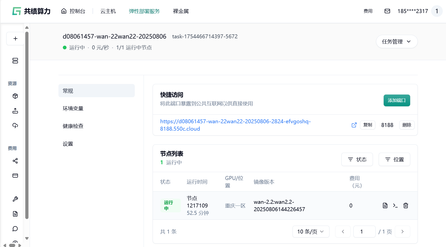 系统会自动分配一个可公网访问的域名,点击 8188 端口的链接。接下来我们即可自由地通过使用工作流在 comfyui 中使用 WAN2.2 模型进行图像生成。