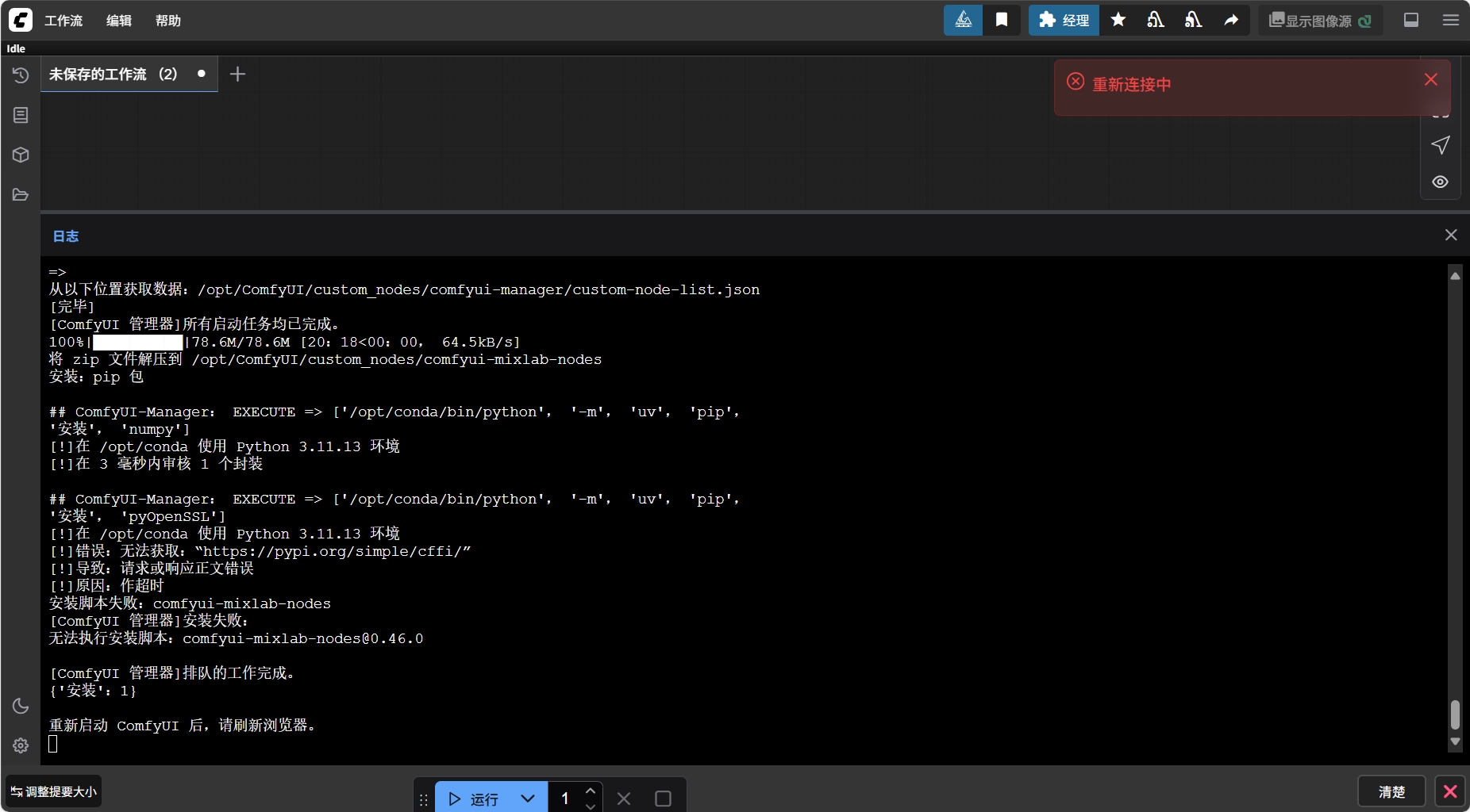 当通过 ComfyUI Manager 自动安装时导入失败此时点击 尝试修复 大概率无法正常修复