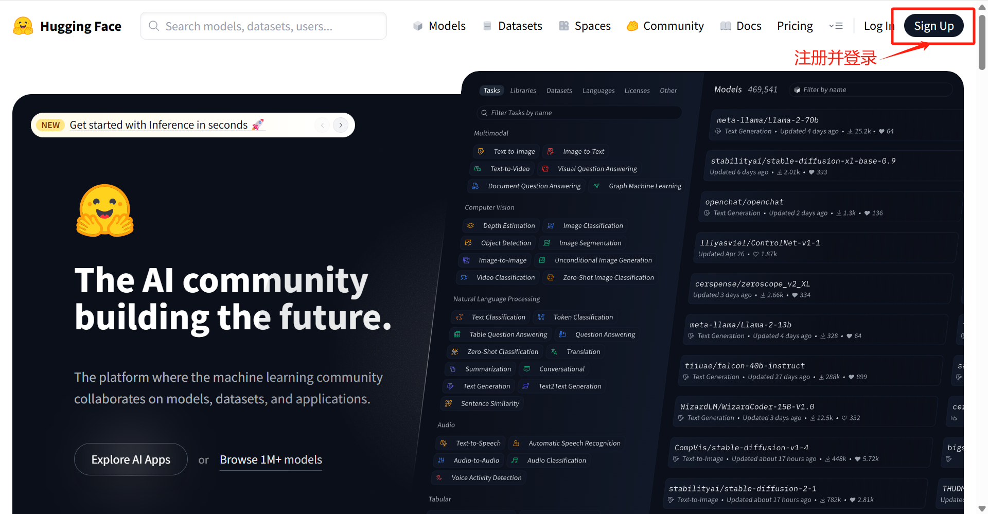 Section titled “3.Hugging face 相关准备”- 登录https://huggingface.co官网,点击右上角 Sign Up 注册账号