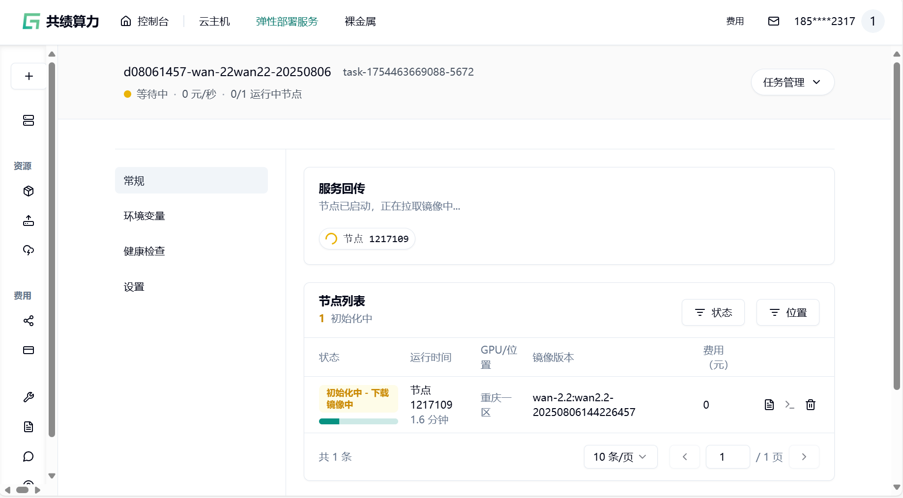 1.4 点击部署服务,耐心等待节点拉取镜像并启动。