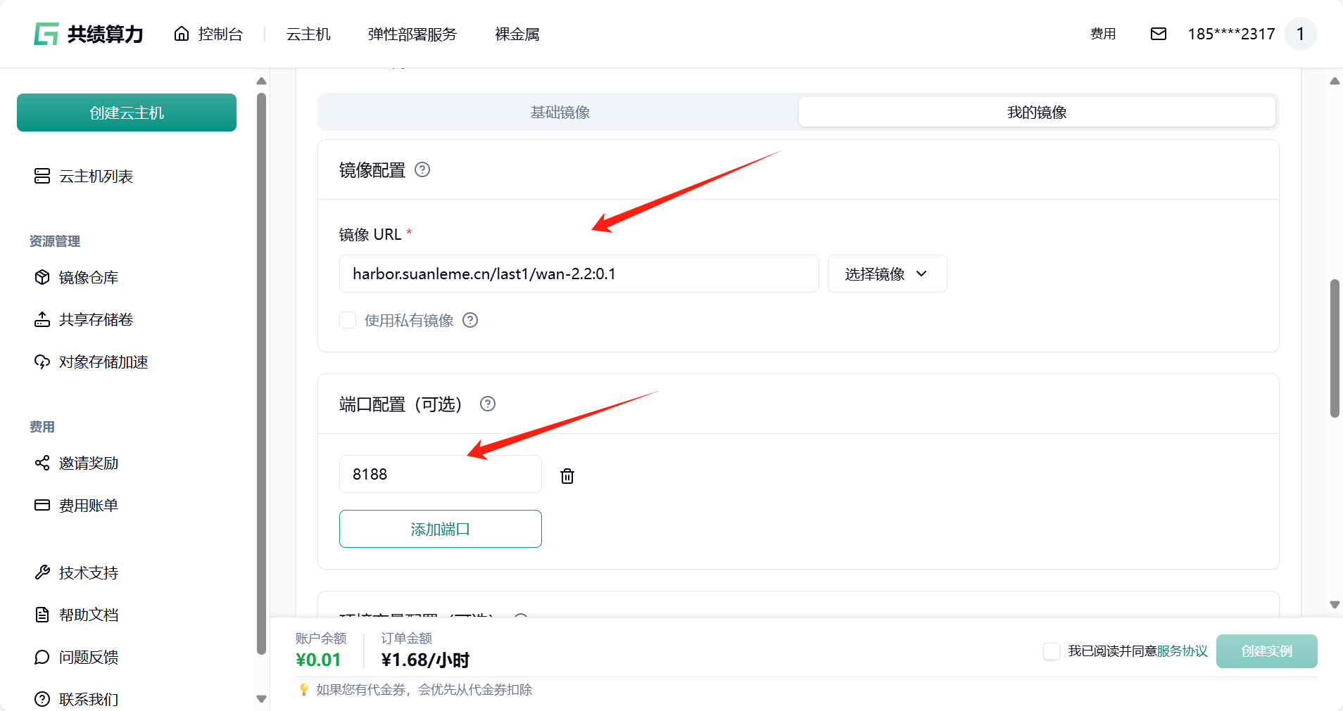 1.1 访问云主机控制台 https://console.suanli.cn/server/instances,点击创建云主机