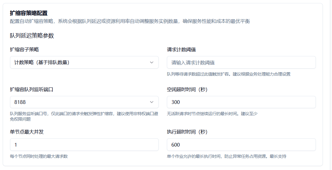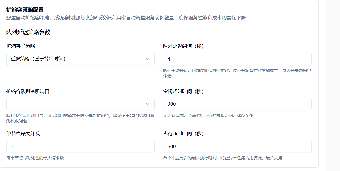 Section titled “3.2 创建任务时配置”在 弹性部署服务 任务创建页面,您可以在「扩缩容策略」配置模块中设置扩缩容策略。系统提供两种主要策略供您选择:延迟策略(基于等待时间)和计数策略(基于排队数量)。