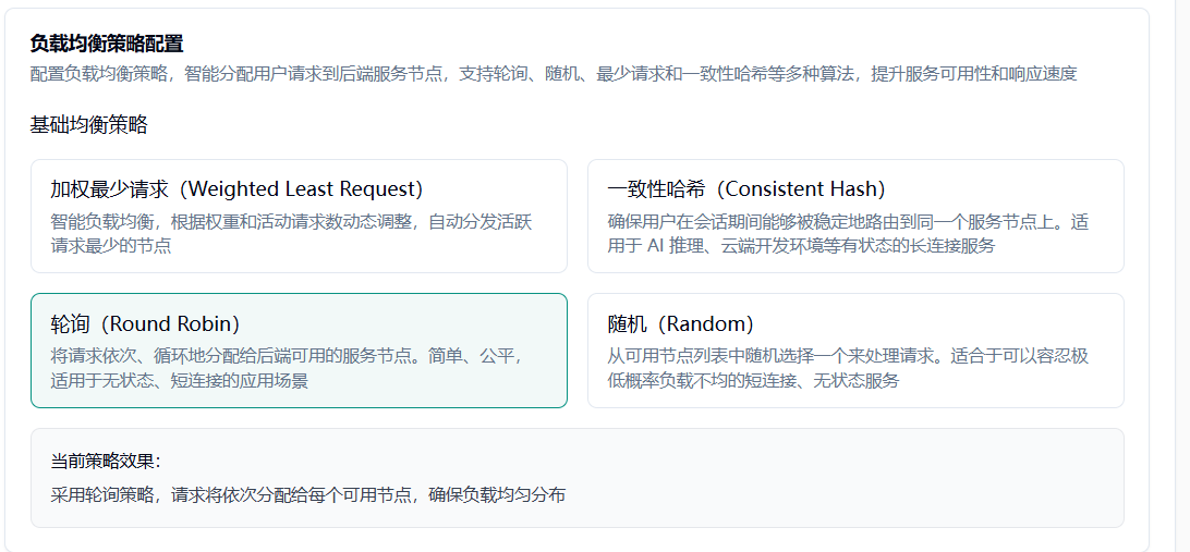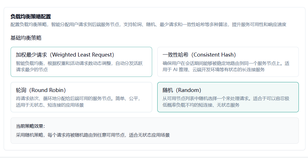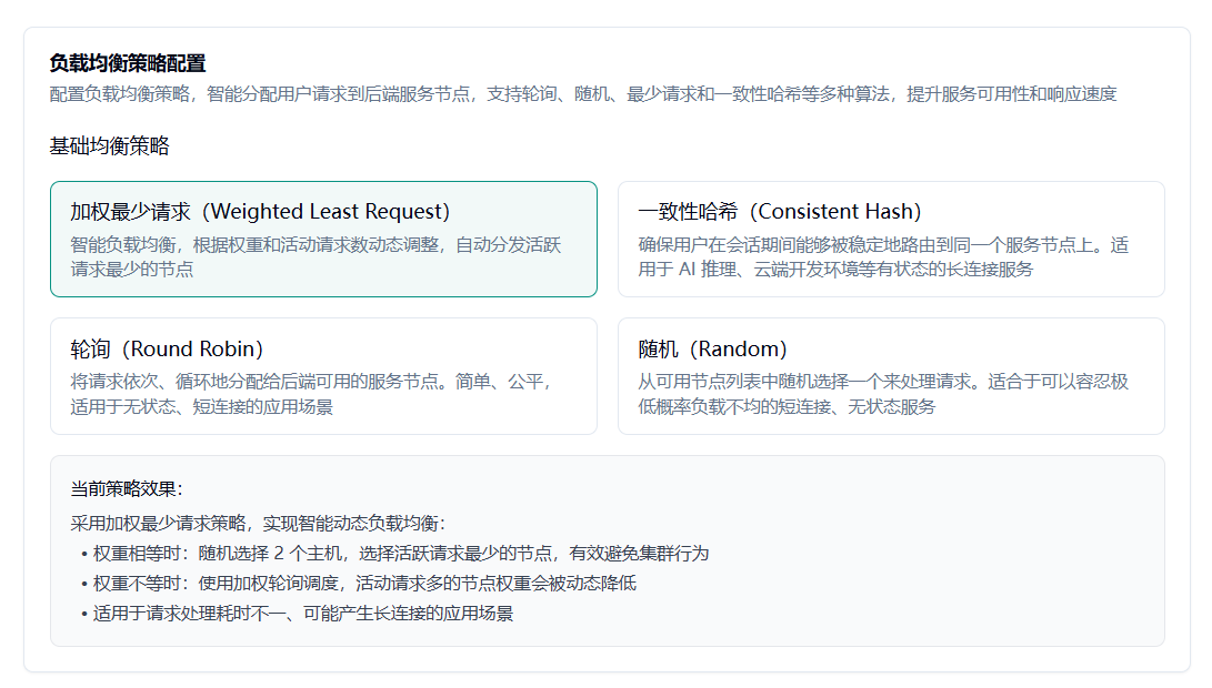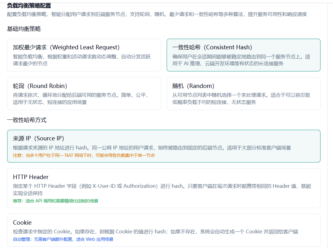 Section titled “5.2.1 来源 IP 策略”根据请求来源的 IP 地址进行 hash。同一公网 IP 地址的用户请求,始终被路由到固定的后端节点。适用于大部分标准客户端场景。