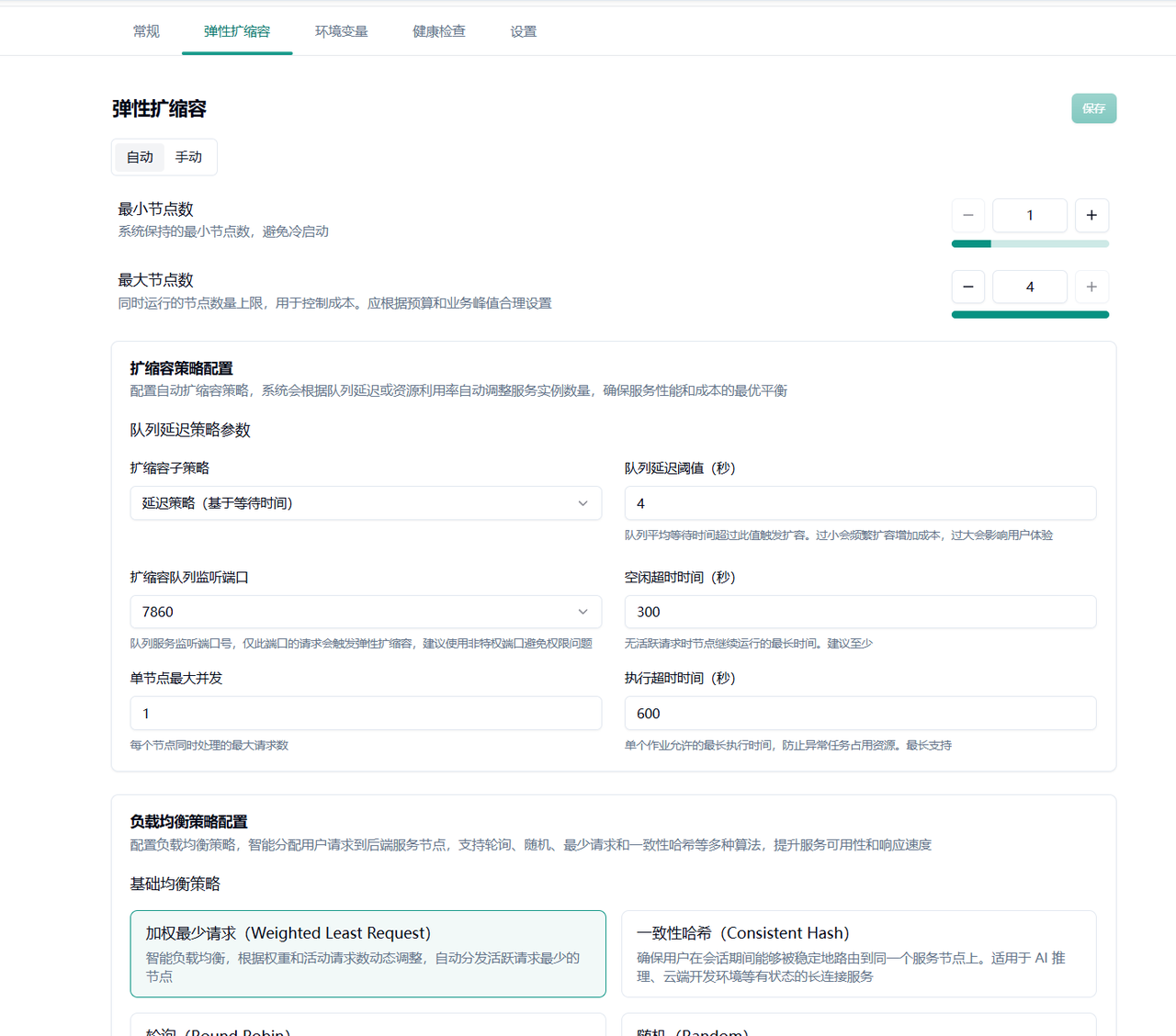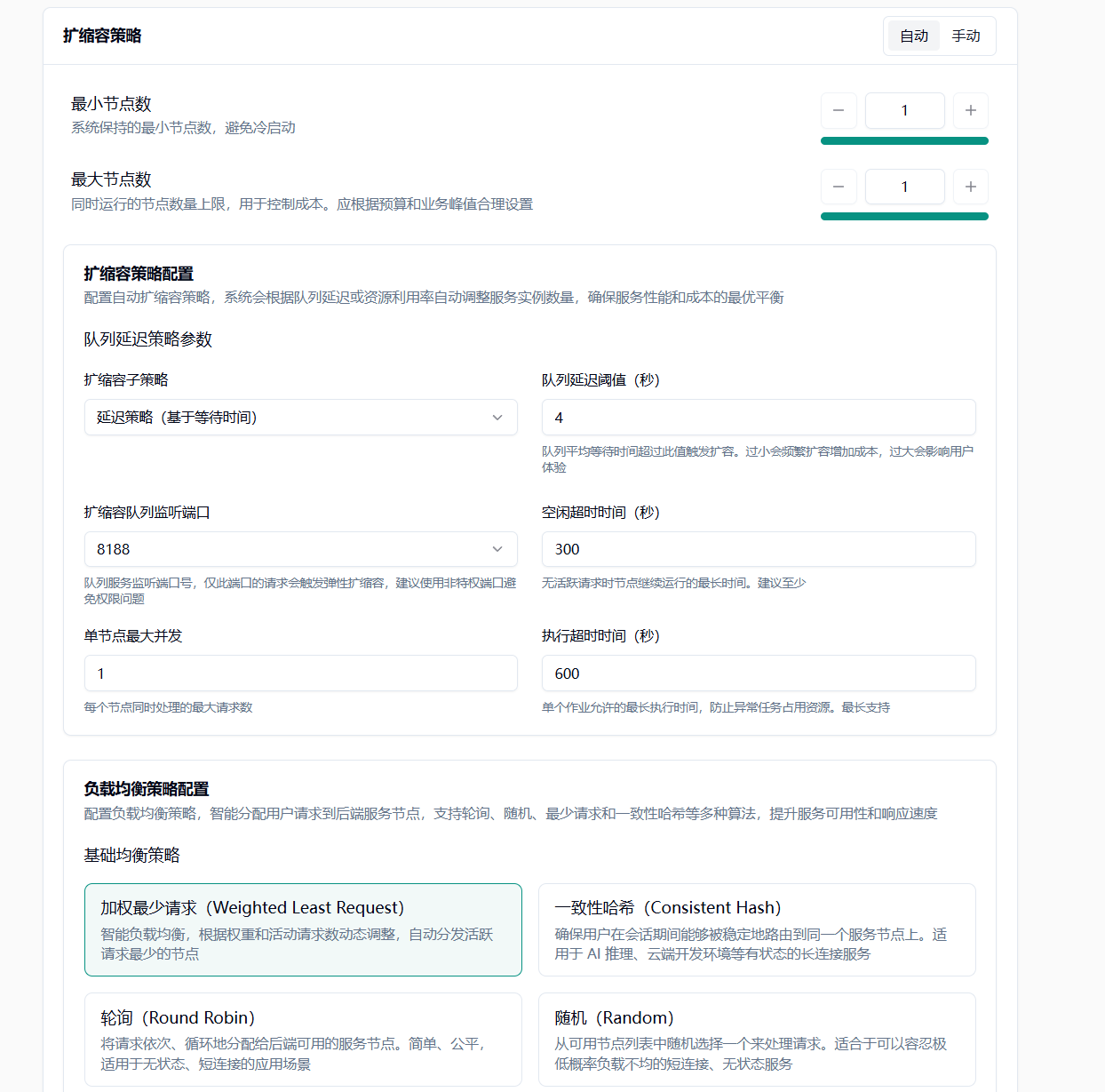 Section titled “4.1.1 基本参数配置”最小节点数:系统保持的最小节点数量,建议设置为 1,避免冷启动影响。默认值:1,最小值:1,最大值:租户剩余可用 Pod 数。