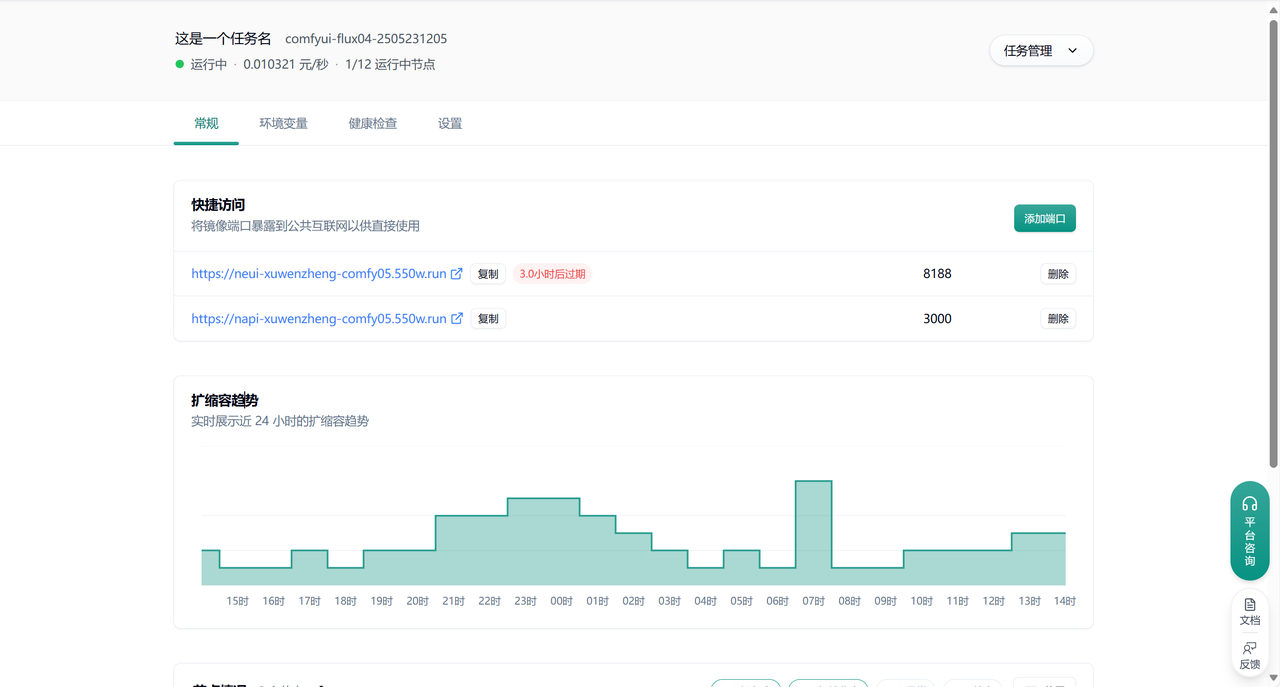 Section titled “3.4 实时监控”系统提供 24 小时扩缩容趋势图表,以半小时为颗粒度展示节点数量变化,帮助您了解资源使用情况。