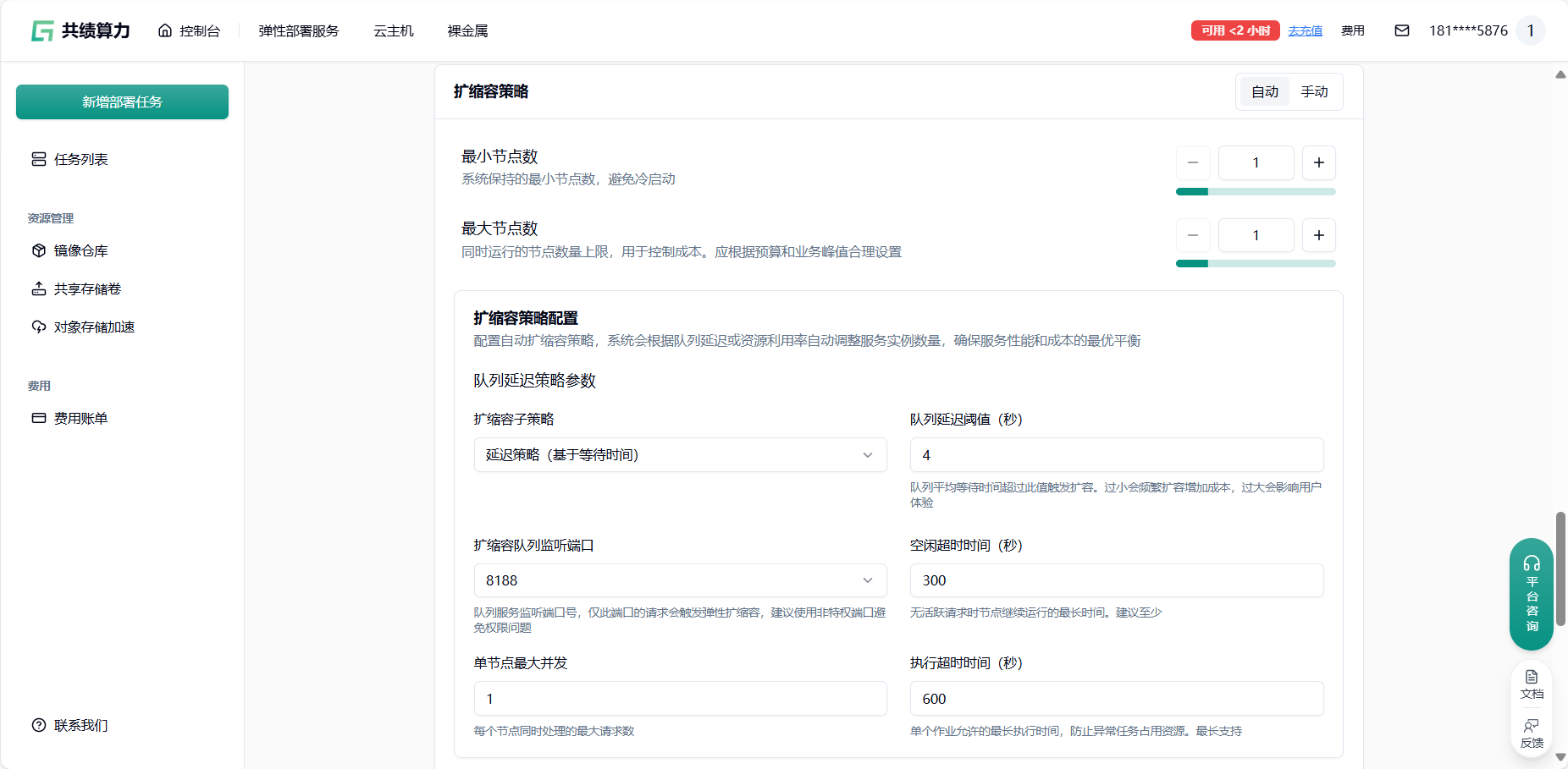 Section titled “1. 功能概述”弹性扩缩容是共绩算力平台的核心功能,能够根据任务队列状态和资源使用情况自动调整计算实例数量,在保证用户体验的同时优化成本效率。通过智能监控,系统可以自动扩容应对高负载,在负载降低时自动缩容节省成本。