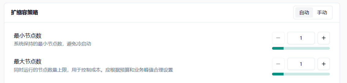 Section titled “3.1 参数设置建议”最小节点数:建议设置为 1,避免冷启动影响。如果业务对响应时间要求极高,可以适当增加。