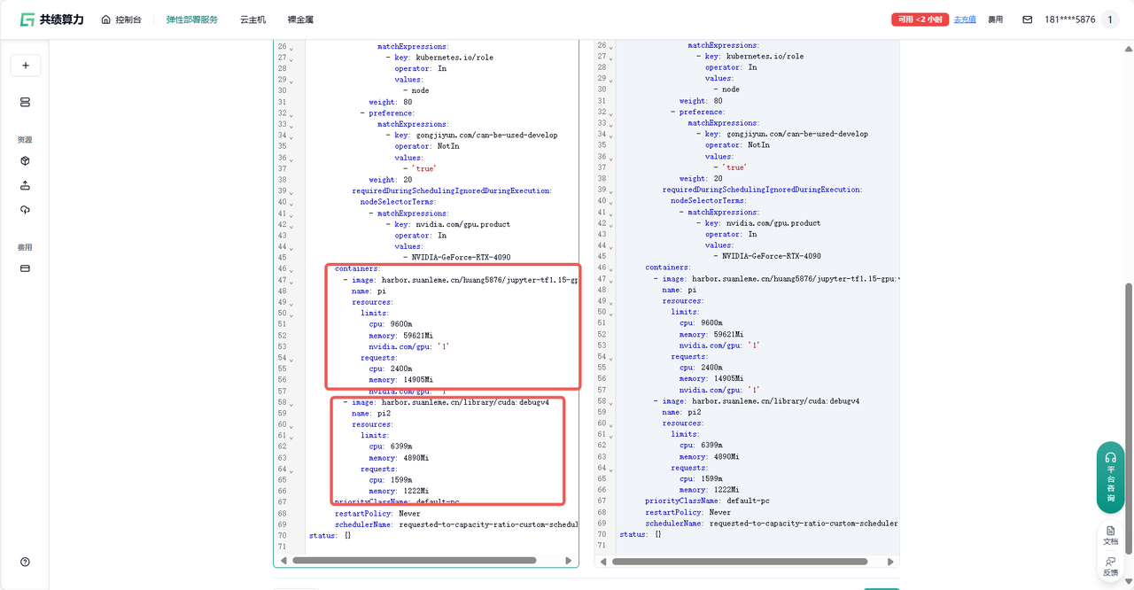 apiVersion: batch/v1kind: Jobmetadata: creationTimestamp: null name: pispec: backoffLimit: 4 template: metadata: creationTimestamp: null spec: containers: - image: harbor.suanleme.cn/huang5876/jupyter-tf1.15-gpu:v3.0 name: pi resources: limits: cpu: 14000m nvidia.com/gpu: 1 memory: 51200Mi requests: cpu: 1166m nvidia.com/gpu: 1 memory: 2133Mi - image: harbor.suanleme.cn/library/cuda:debugv4 name: pi2 resources: limits: cpu: 9333m nvidia.com/gpu: 1 memory: 4200Mi requests: cpu: 2333m nvidia.com/gpu: 1 memory: 10666Mi restartPolicy: Neverstatus: {}4.多容器资源分配算法