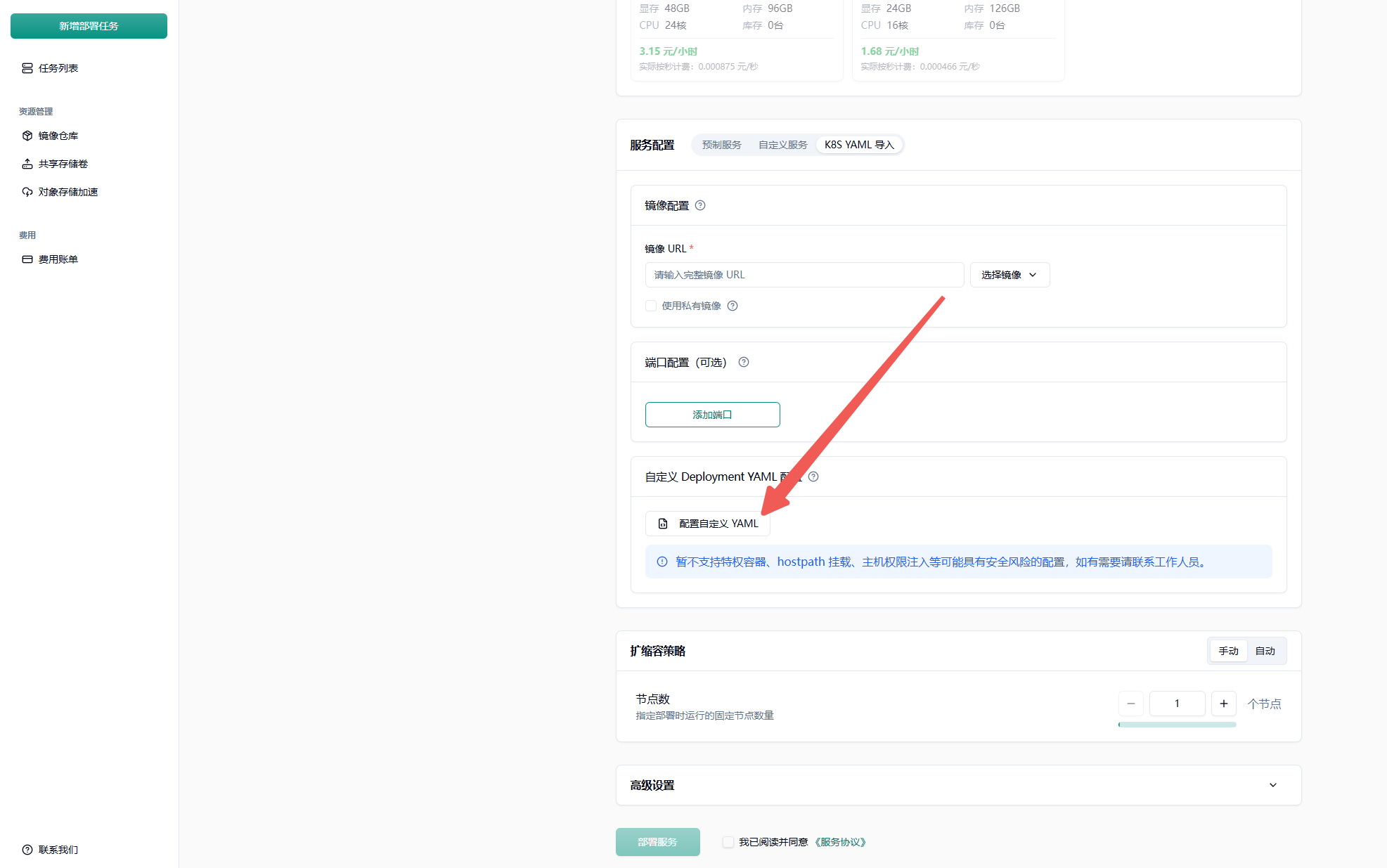 Section titled “2 通过弹性部署发布”在弹性部署服务任务创建页面,您可以通过可视化界面配置和发布 Job 任务。首先进入弹性部署任务创建页面,点击 K8S YAML 导入在资源配置部分,选择需要的 GPU 类型和数量。