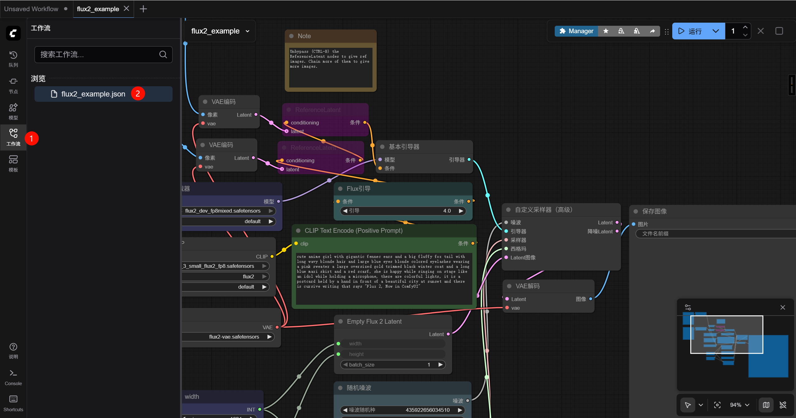 进入 comfyui 界面以后按下图序号先选择左侧栏的工作流菜单,再点击打开默认的 flux2_example.json 文件,此时可以发现这是一份默认的测试工作流